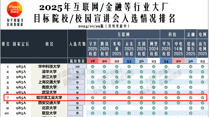在当今的就业市场中,互联网大厂以优厚的薪资待遇、完善的福利体系、广阔的成长空间以及前沿的技术环境,成为当下最受毕业生欢迎的出路之一。华为、腾讯、字节等大厂“精选”的校招高校,既能反映出当前大厂对新一代人才要求的标准,也成为了考生择校的“风向标”。从大厂的校园宣讲情况来看,华中科技大学位列榜首,清华、浙大、哈工大、交大等7所高校并列第二。这其中,哈尔滨工业大学的就业表现格外引人注目,它不仅在国防航天领域全国顶尖,在互联网大厂方面同样深受青睐。
